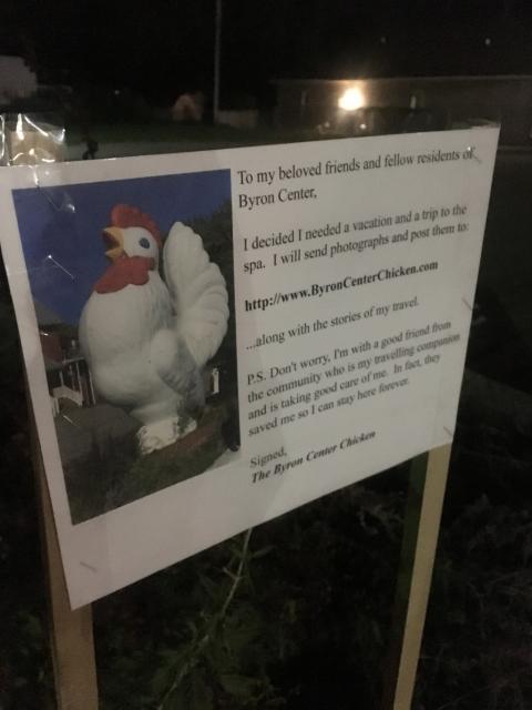 My official name is Byron DeChicken (bet you didn’t know that), and I’m so glad to be a part of this community. My plan is to be here for as long as you would like me to be here. Lately, I’ve had some health issues and a family in Byron Center noticed, bought me, decided to provide health care, and is paying for my visit to the Fiberglass Chicken Hospital. The people at this hospital are professionals, not just quacks in their garage – I’m going to be in better shape than I’ve ever been!